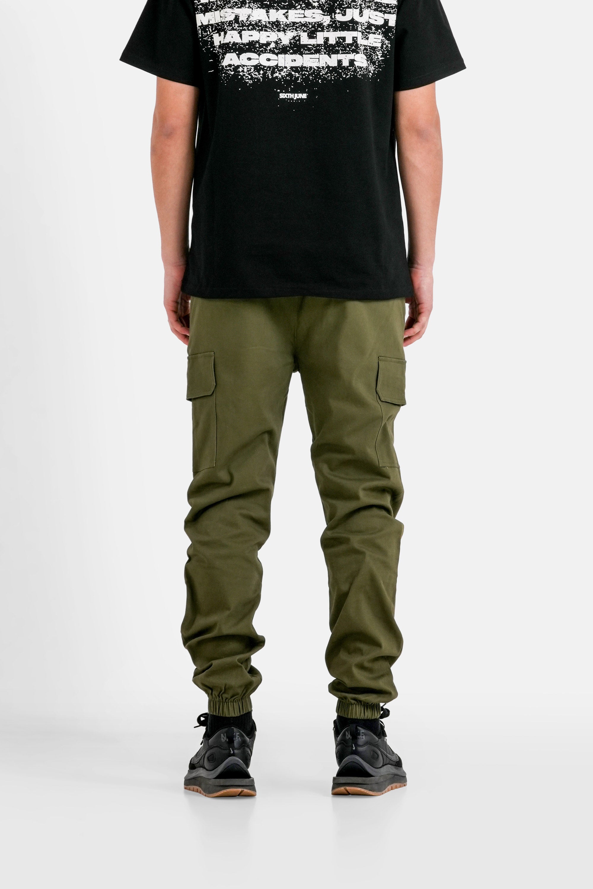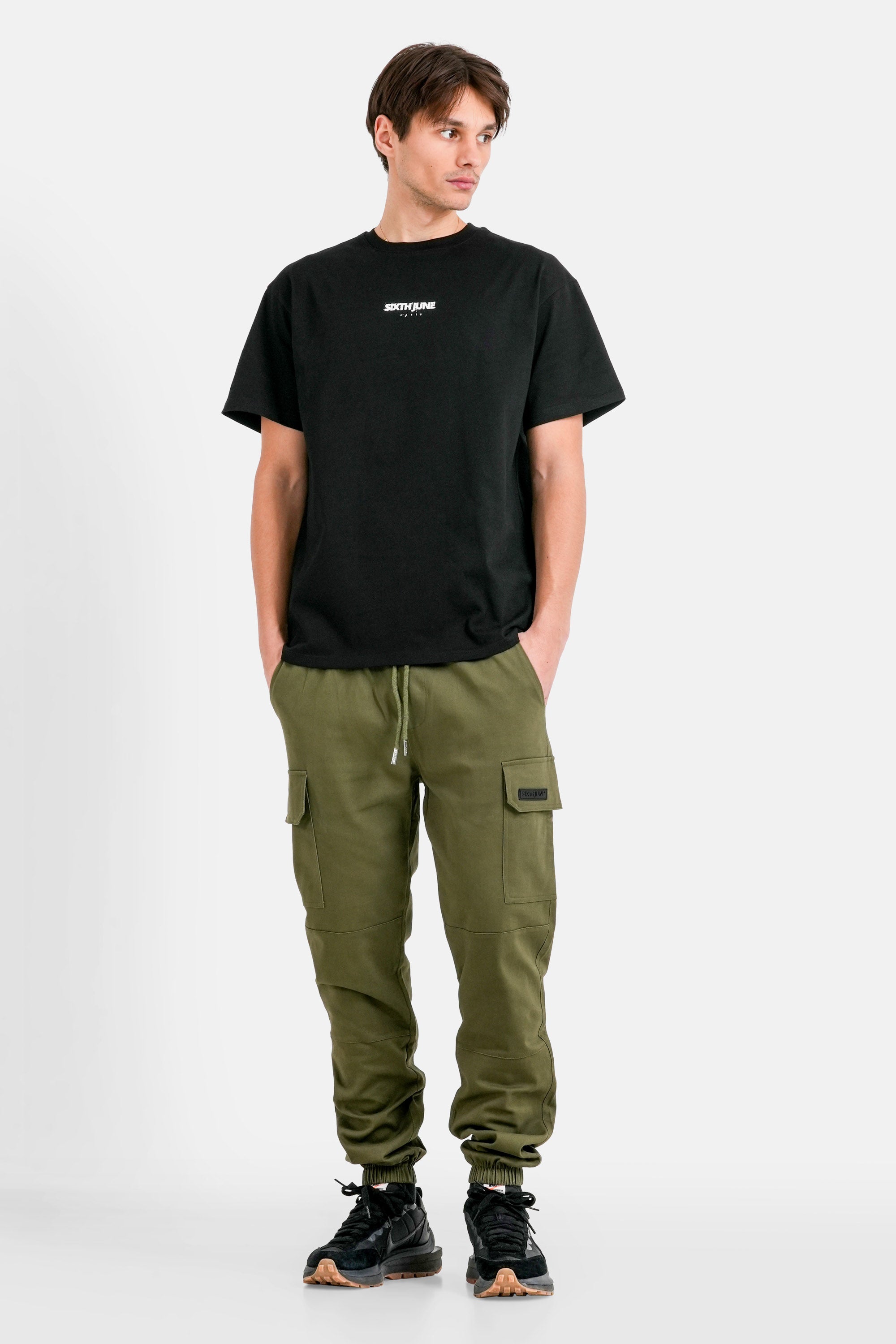 Side pockets, elastic waistband with drawstring, elastic ankles, back patch pockets.