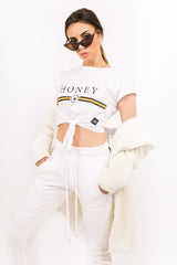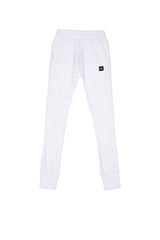 Sixth June women joggers with an elastic strip and long drawstrings at the waist. Front and back pockets, slim cut and slightly high-waisted. White model.