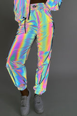 Sixth June joggers for women. Totally reflective (shiny effect under the light) with petrol effect. Elastic and drawstring waist, elastic on ankles, side and back pockets. Regular cut. Black design.