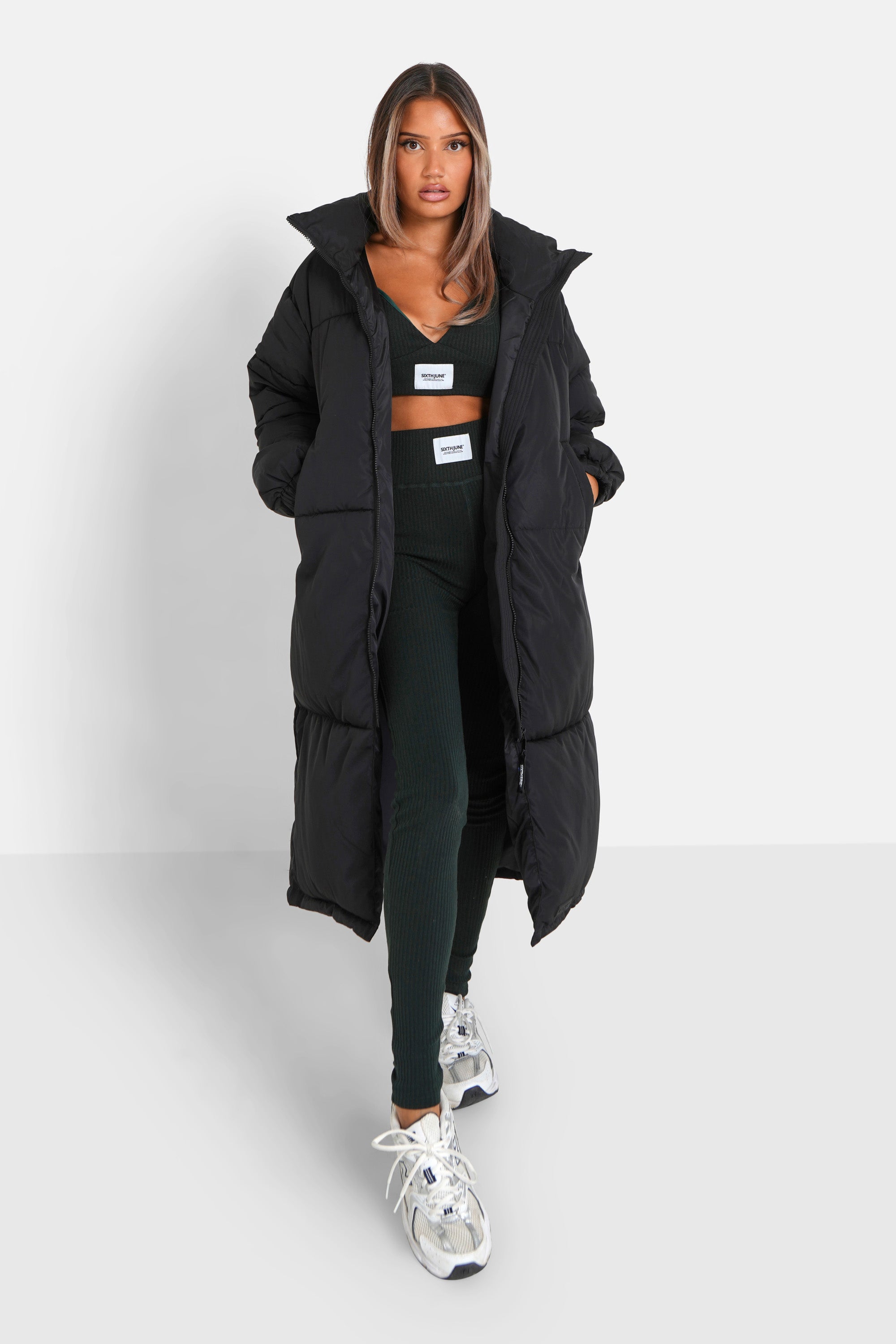 Sixth June puffer for women. Padded and quilted effect, high collar with SIXTH JUNE printed on the neck. Side pockets with zipped fastening, inner pocket and central zipped fastening, logo on a rubber patch on the front. Regular and very long cut. Very padded down jacket. Black design.