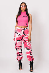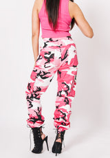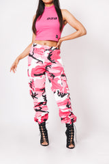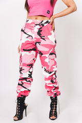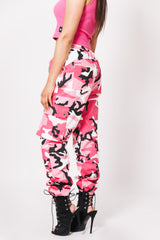 Sixth june cargo pants for women with camo prints. Large cut, elasticated waist, cargo side pockets, fitted cuffs and back pockets. Pink camo design.