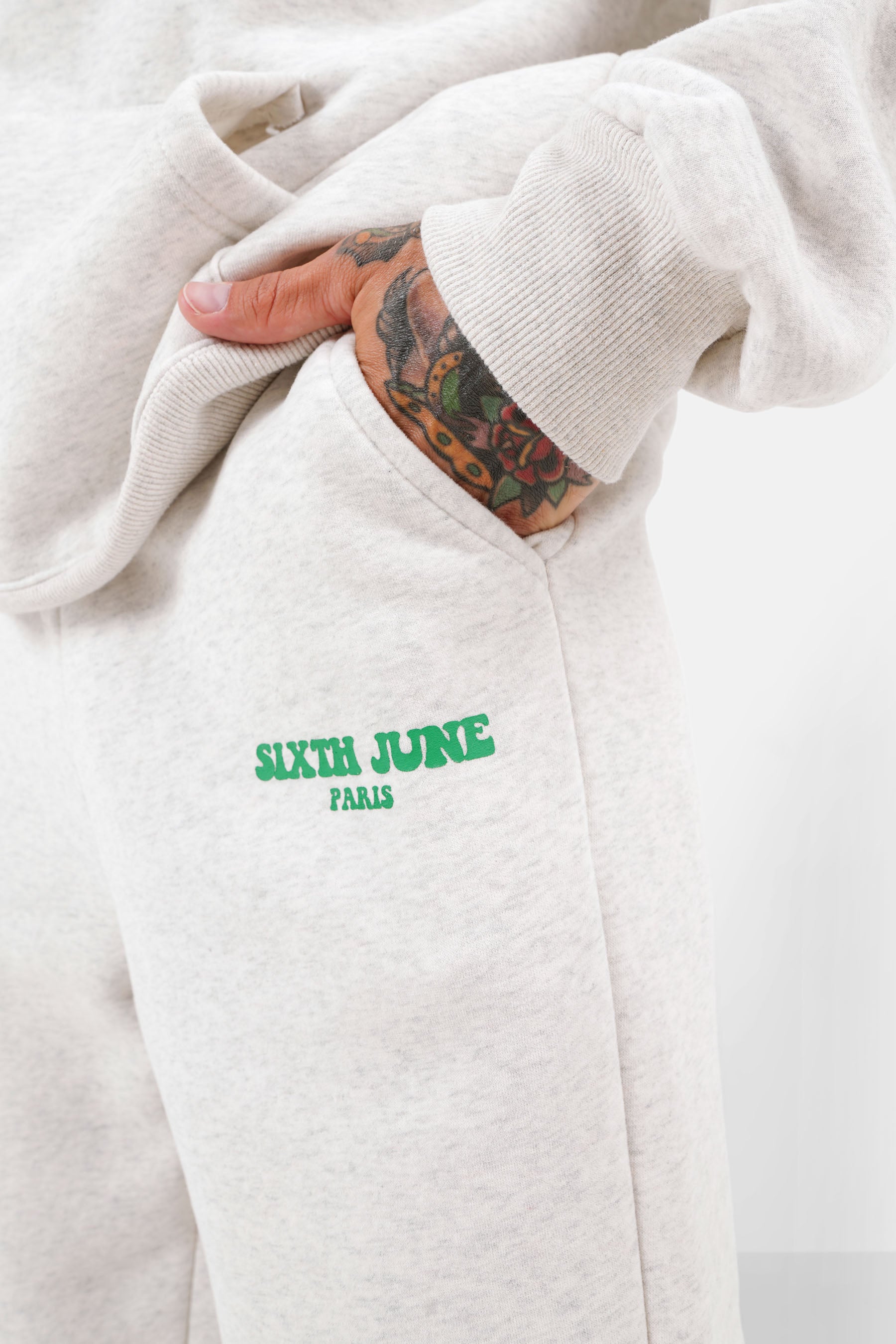 Retro print on front left pocket, side pockets, elasticated waistband with drawstring, faux pockets on back.
