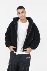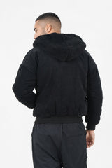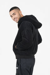 Sixth June jacket for men. Reversible: a part in sherpa fabric and a part in a ribbed fabric. Inside and outside hood in sherpa, zipped fastening, side pockets (in the ribbed part). Regular cut, dropped shoulders. Regular cut. Black design.