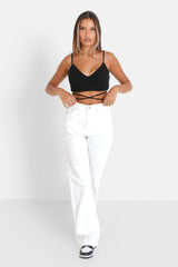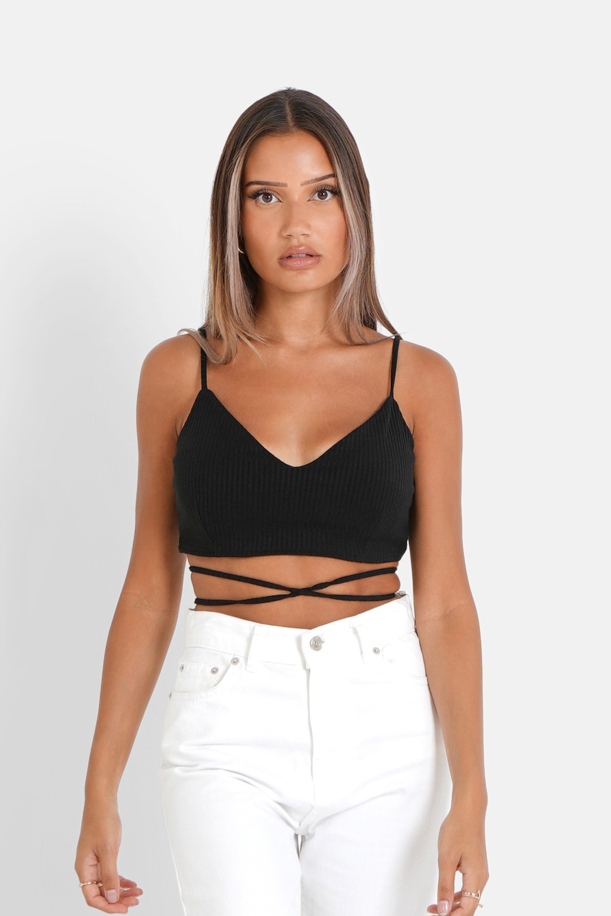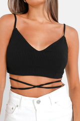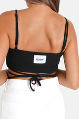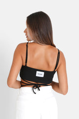 Sixth June top for women. Ribbed fabric, drawstrings to be tied in the front or in the back. Adjustable straps, woven logo on a patch in the back. Cropped cut. Black design.