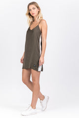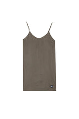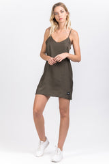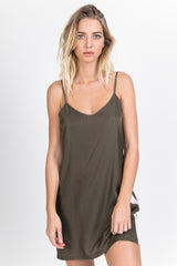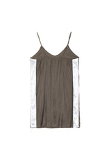 Sixth June women dress in a satiny fabric and with white stripes on the sides. Thin fabric, spaghetti straps and short cut. Khaki model.