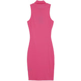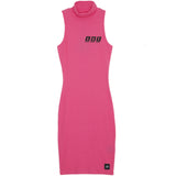 Sixth June dress with SXT brand initials printed on the front. Skinny cut, mini length, funnel neck, ribbed fabric and sleeveless. Pink design.