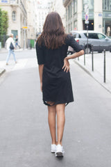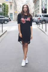 Sixth June t-shirt dress with roses and Bad Gal embroidered on the front, and destroyed style at bottom. Large cut and dropped shoulders. Black model with green and red embroideries.