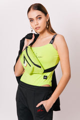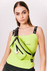Bumbumbag for men and women with logo print to front. Taped zip closure, adjustable body strap, external pocket and secure clasp fastening. Lime design. Size: 11 inches, 28cm.
