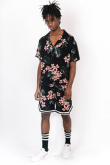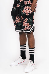 Sixth June shorts for men with all-over floral print. Long and regular cut, basketball inspired design, drawstring waistband, side pockets and single back pocket, three-coloured taping detail and v-shaped opening. Black and pink design.