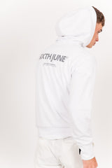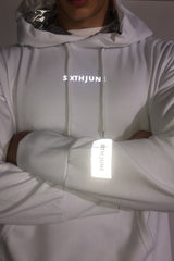 Sixth June hoodie for men. Silver interior hood, shiny effect. Reflective logo on the back, front and left arm. Inscritions printed on the back SIXTH JUNE / Streestyle 28469 / 72362 PARIS FRANCE depuis 2008. Pouch pocket, elastic and drawstring hood. Classic cut. White design.