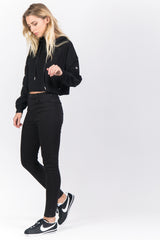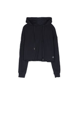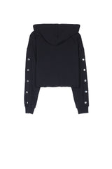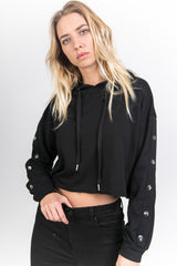 Sixth June women crop top hoodie with buttons along the sleeves. Hood and drawstrings. Short and loose cut. Black model.