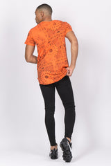 Sixth June men t-shirt with a bandana print on the whole clothing. Regular cut, slightly long with a rounded bottom and a small hem on the sleeves. Orange model with black print.