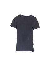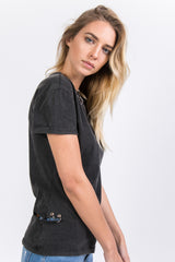 Sixth June women t-shirt with metallic rings on the collar and the chest. Loose cut, short sleeves, little rip on the side and hem on the sleeves. Black model.