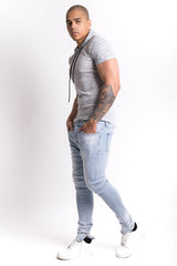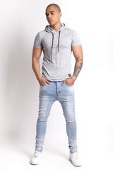 Sixth June men t-shirt with biker yoke on the shoulders and short sleeves. Hood and drawstrings. Regular cut and rounded bottom. Grey model.