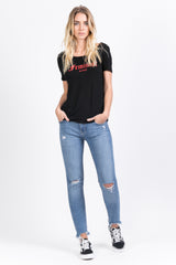 Sixth June women t-shirt with a Feminist de Paris print at the front. Regular cut, thin fabric, round collar and short sleeves. Black model and red print.