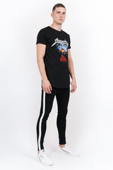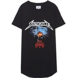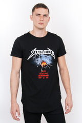 Sixth June T-shirt for men with Sixth June printed to front with a hard rock inspired typography. Regular cut, crew neck, short sleeves and horror moovie prints to front (burning house, thunderbolts).