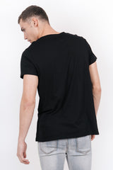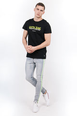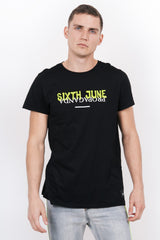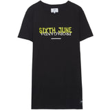 Sixth June T-shirt for men with Propaganda printed backwards and Sixth June printed above it with a graffiti inspired typography. Regular cut (a bit larger and longer than a regular t-shirt), crew neck and short sleeves. Black design with lime print.