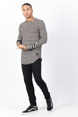 Sixth June men t-shirt with an all over sailor pattern and long sleeves. Fitted cut with a rounded bottom and little zips on the side. Beige model with black stripes.