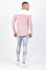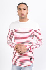 Sixth June men t-shirt with a sailor pattern until the chest and long sleeves. Fitted cut with a rounded bottom and little zips on the sides. White model with red stripes.