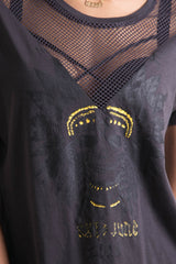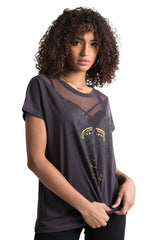 Sixth June women t-shirt with mesh fabric wih V shape, and skull and Sxt June 2018 print. Regular cut and little sleeves. Dark grey model with yellow print.