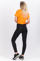 Sixth June women t-shirt with a rose patch on the chest. Short an regular cut, with a knot on the bottom and a little hem on the sleeves. Orange model.