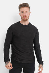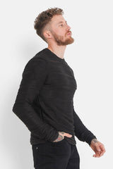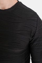 Sixth June men t-sirt with a fabric in relief, with a wave effect and oversize sleves. Skinny cut with a slightly rounded bottom. Black model.