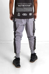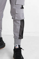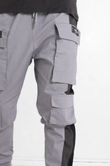 Sixth June cargo pants for men. Tricolored fabric, cargo pockets on the front with velcro closure. Elasticated waist with drawstring, tight ankles, side and back pockets. Grey design.