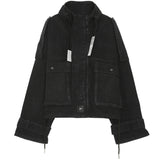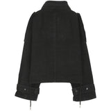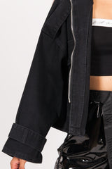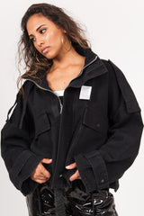 Sixth June oversize denim jacket for women. Removable strap attached to neck printed GOOD HEART. BAD TEMPER. and an extract of « Phèdre » from Jean Racine. Fitting collar, drawstring waist, zip-back fastening. Oversize cut, casual. Black design.