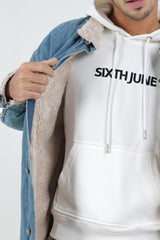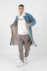 Sixth June men denim jacket with a long cut and a fake fur lining. Dropped shoulders, zips on wrists and button fastening. Blue model with beige inside.