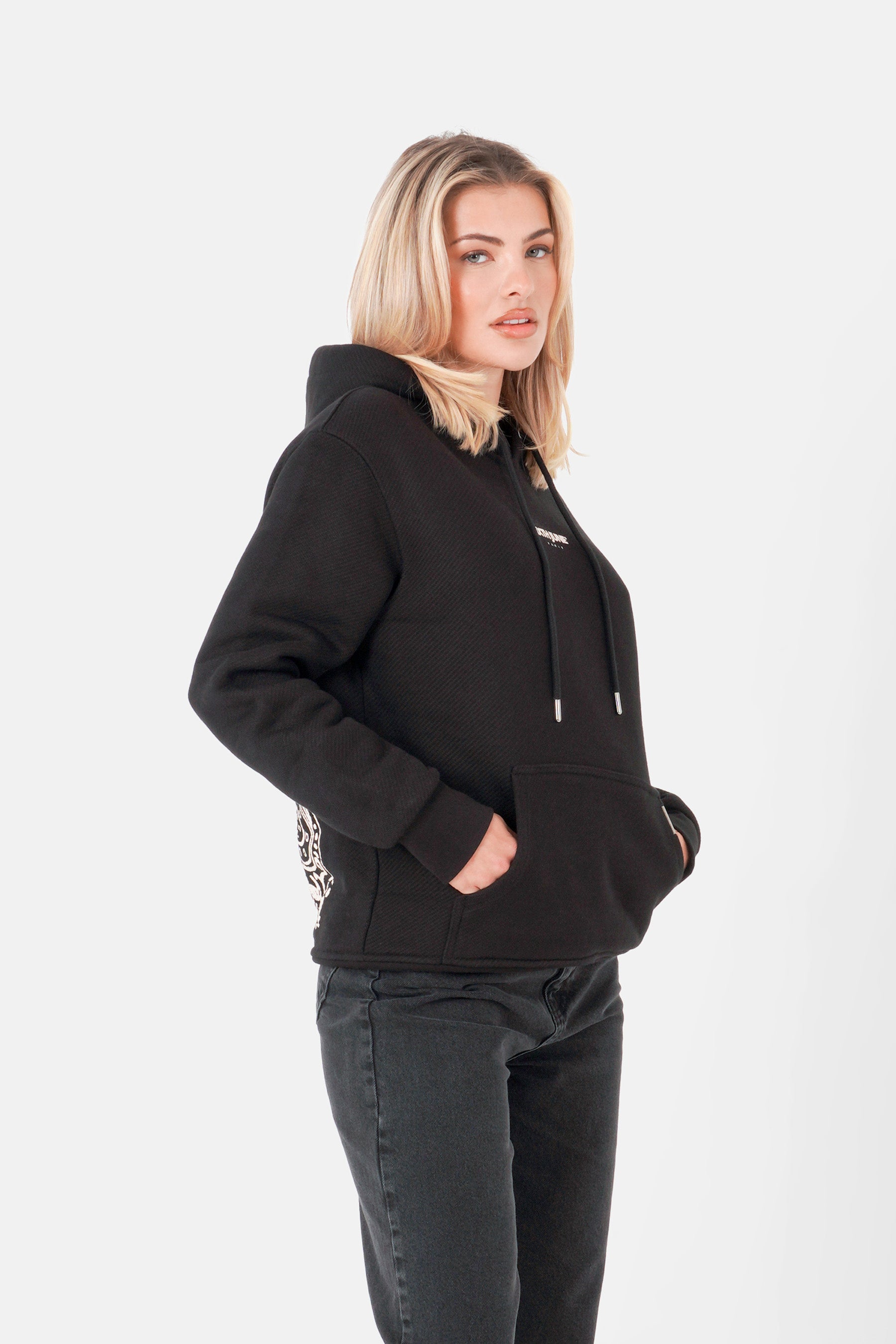 Poche kangourou à l'avant, logo patch au niveau du centre de la capuche, cordon de serrage au col.