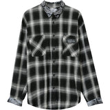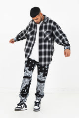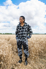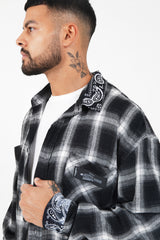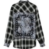 Imprimé tartan sur l'ensemble du tissu et imprimé bandana dans un tissu différent dans le dos, aux extrémités des manches et sur le col. Effiloché à la base, poche à l'avant, fermeture boutonnée, col à revers.