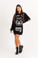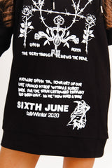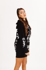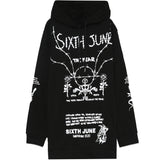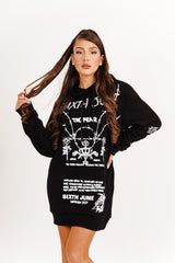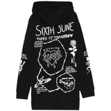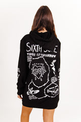 Robe sweat pour femme de marque Sixth June. Plusieurs imprimés dont avec clé encerclée de roses avec épines. Imprimé à l'arrière avec un coeur en sang encerclé de barbelé, os cassé, main renfermant un poignard. Capuche avec cordons de serrage. Coupe classique. Modèle noir.