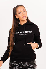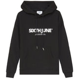 Sweat à capuche pour femme de marque. Grand imprimé Sixth June sur l'avant au centre, poche kangourou et cordons de serrage sur la capuche. Coupe classique. Modèle blanc.