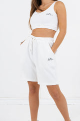 Short pour femme de marque Sixth June. Signature brodée sur la jambe gauche. Cordons de serrage à la taille, poches latérales, fibre douce. Coupe classique, mi-longue. Modèle blanc.
