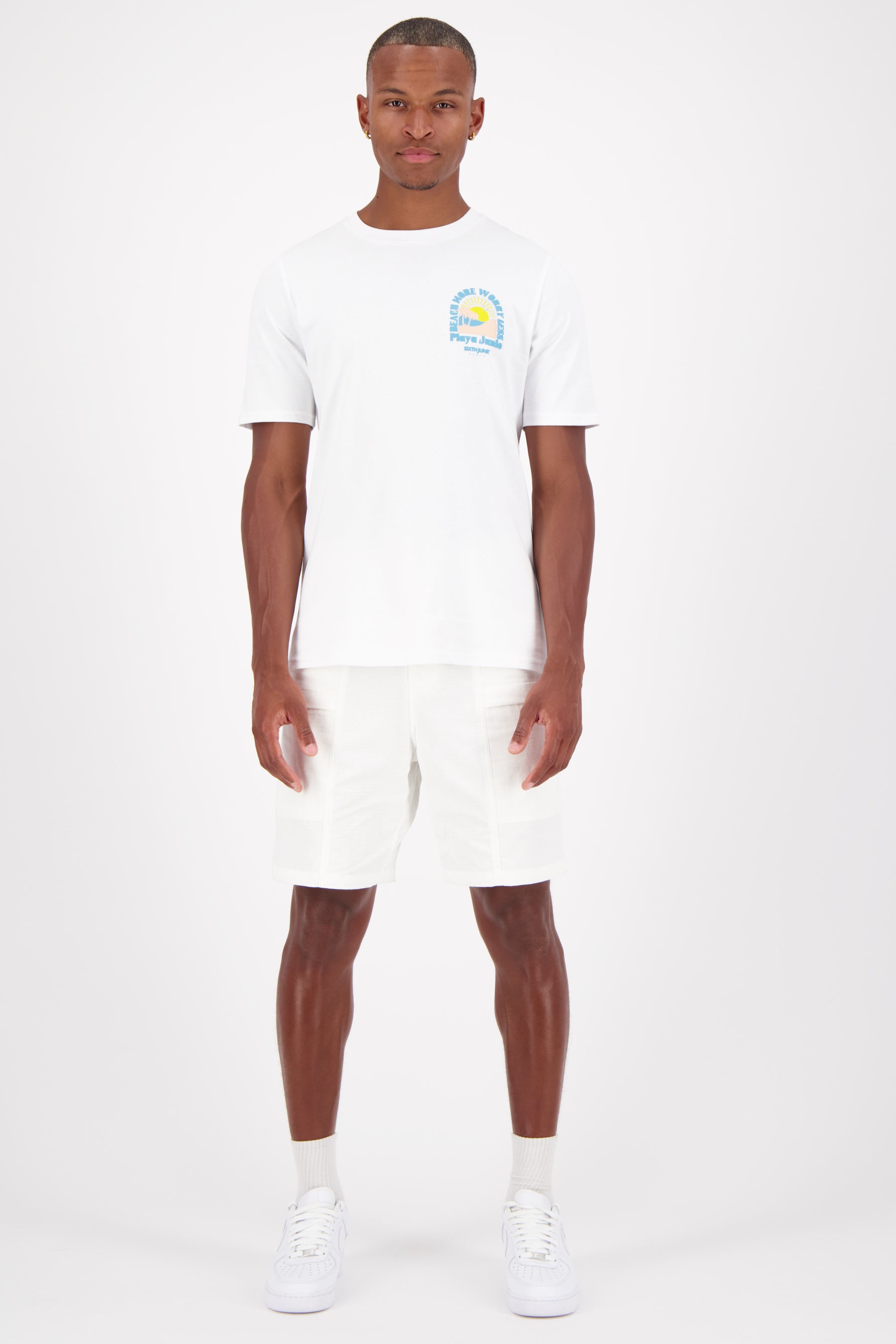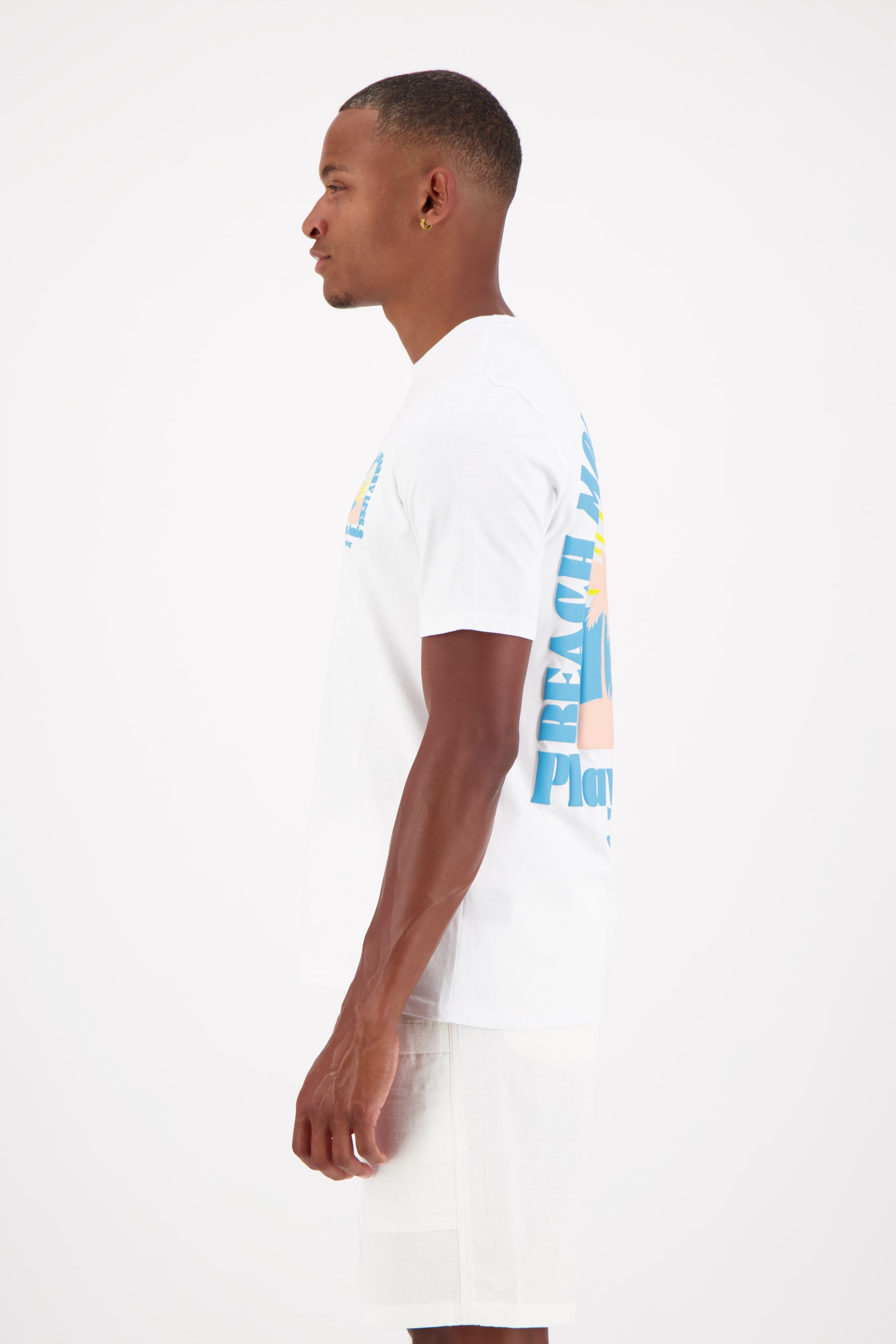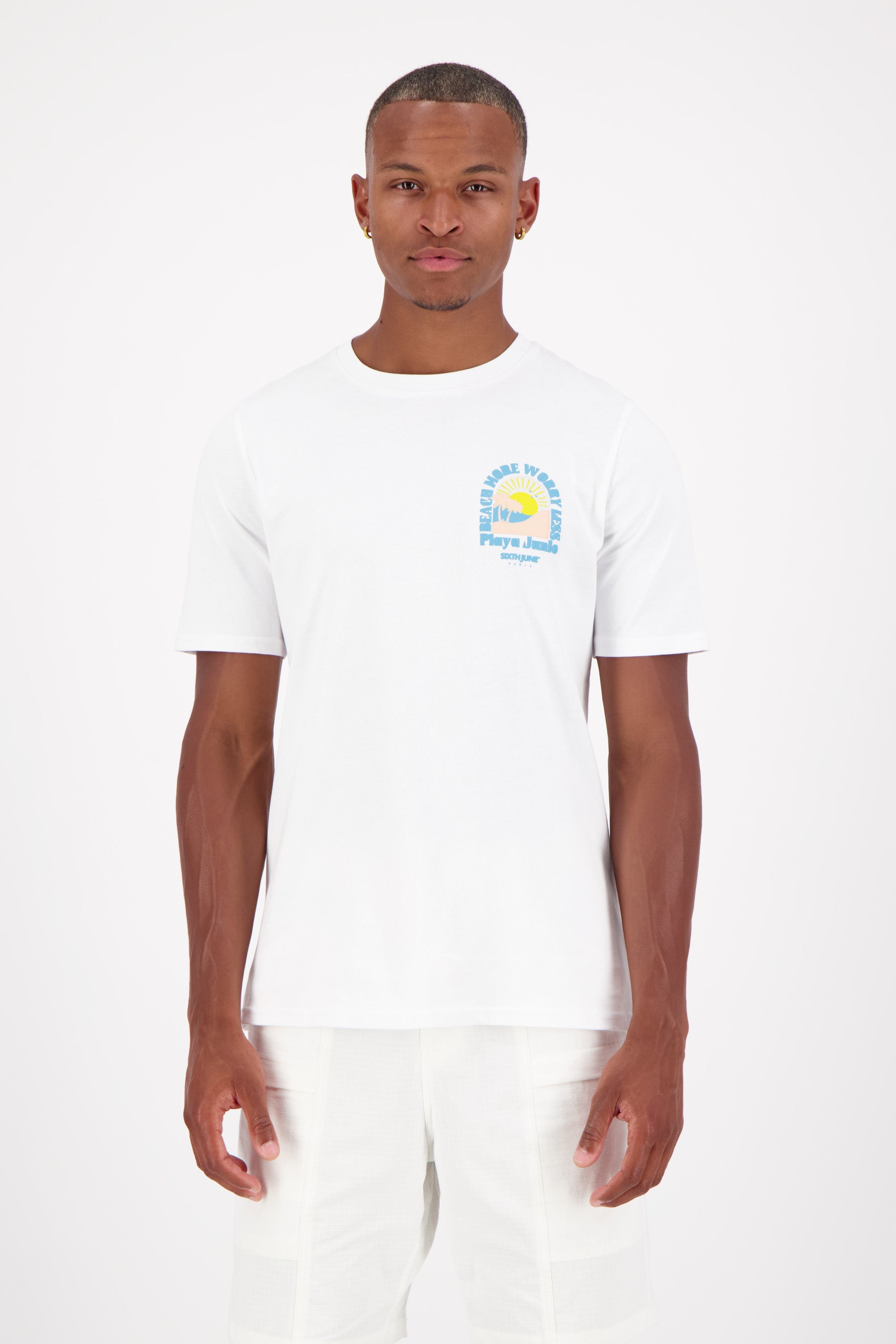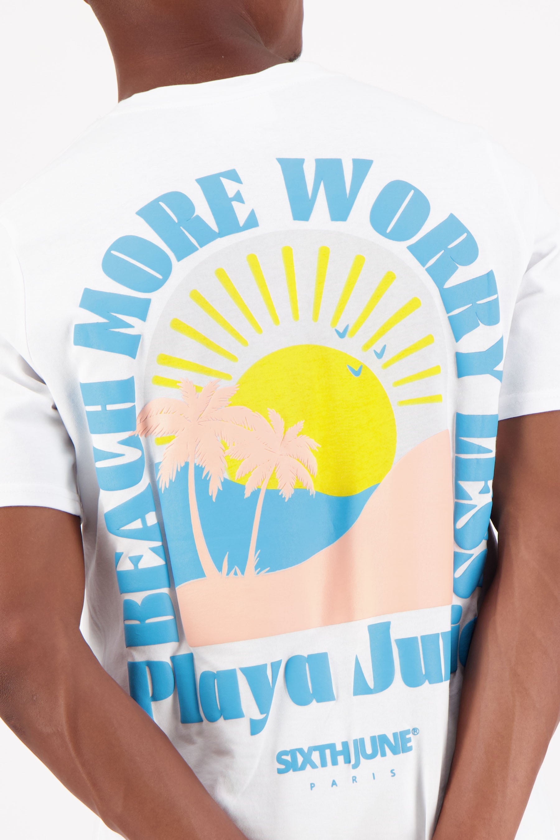 Grand imprimé de plage américaine avec le slogan "BEACH MORE WORRY LESS PLAYA JUNIO" à l'arrière et en petit à l'avant.