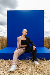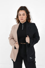Côté gauche noir et côté droit beige. Poches à l'avant avec rabats, fermeture à bouton, patch satiné imprimé Sixth June.