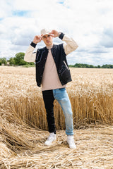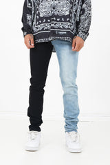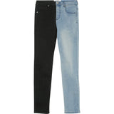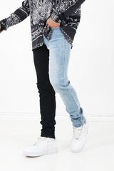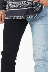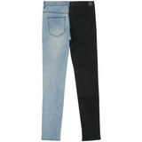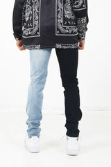 Une jambe de couleur noir et une autre de couleur bleu. Poches à l'avant et à l'arrière, fermeture boutonnée.