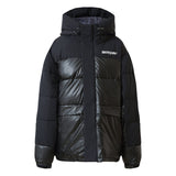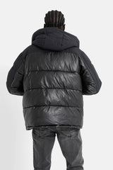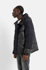 Bi-matière en nylon noir et noir métallisé, effet matelassé et rembourré, logo Sixth June imprimé près de l'épaule.