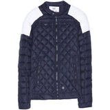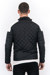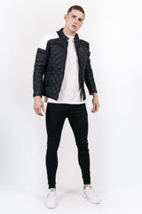 Blouson matelassé homme Sixth June avec empiècements biker au niveau des épaules. Coupe très ajustée (près du corps), deux poches latérales zippées, poche inétrieure, deux poches poitrines zippées, fermeture à zip et boutons à pression au col. Modèle noir avec empiècements blancs.
