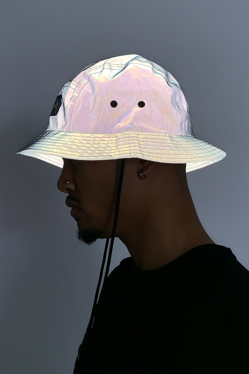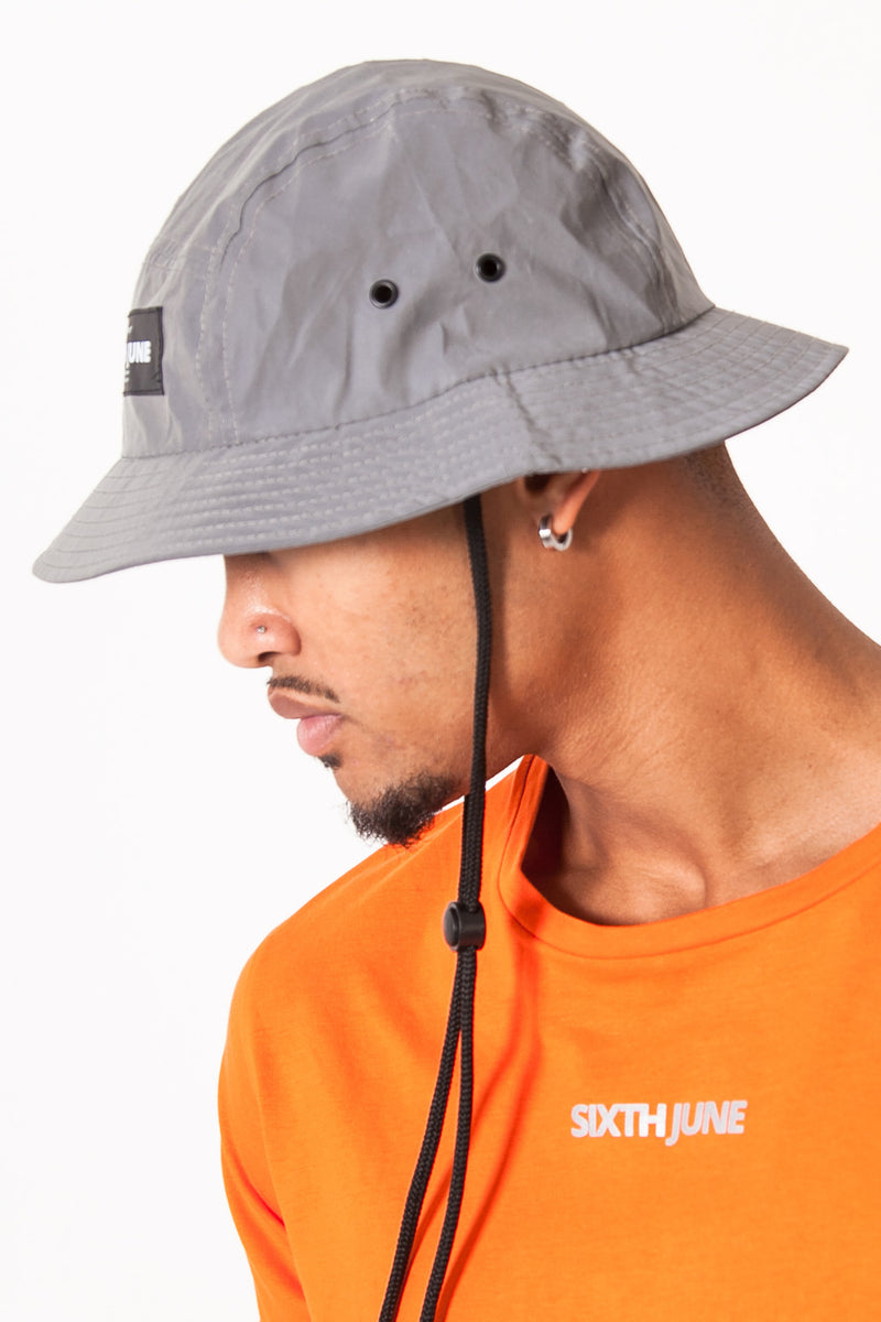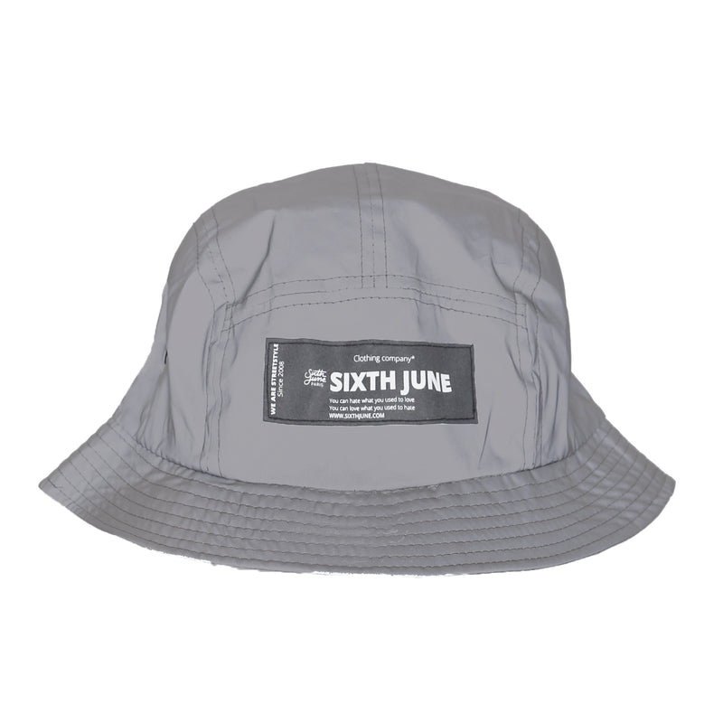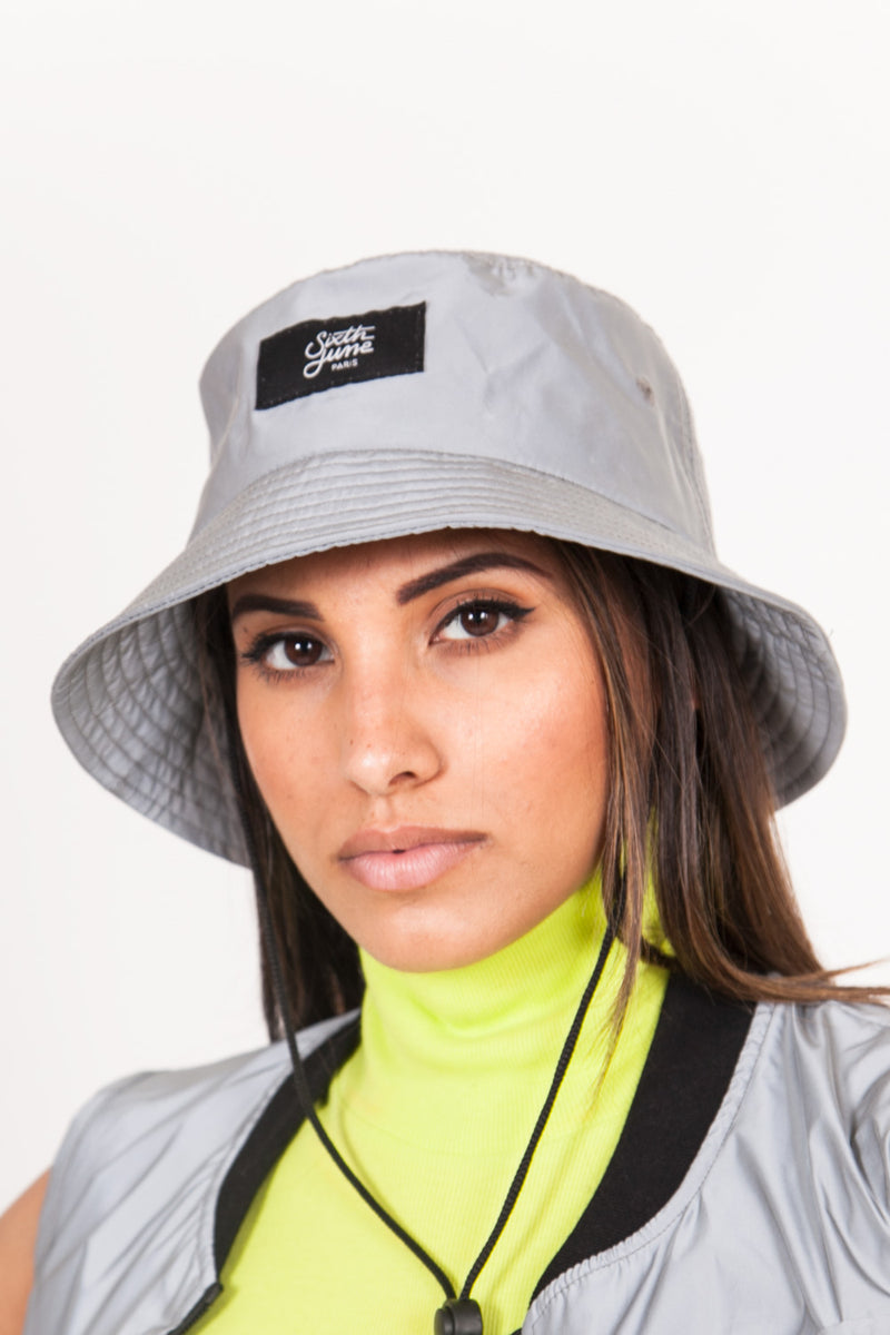 Bob pour homme et femme de marque Sixth June. Entièrement réfléchissant, effet brillant à la lumière. Patch réfléchissant avec inscriptions à l'avant, cordons. Modèle gris très foncé.