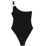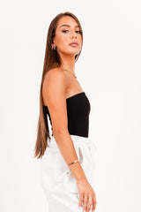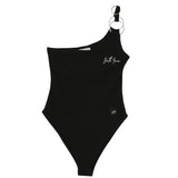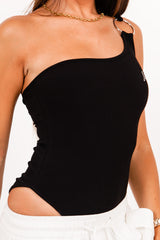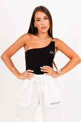 Body pour femme de marque Sixth June. Une bretelle avec boucle métallique. Imprimé logo sur la poitrine, matière côtelée. Coupe ajustée. Modèle noir.