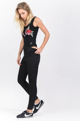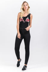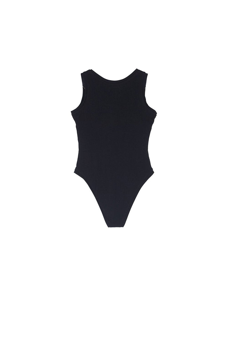 Body femme Sixth June avec un imprimé central Sixth June Paris et des broderies fleurs à l'avant. Coupe moulante avec un col rond et une fermeture boutonnée au niveau du bas. Modèle noir.