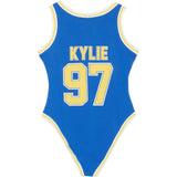 Body Sixth June pour femme au couleur de l'équipe de basketball américaine: Golden State Warriors. Coupe moulante, inscriptions "Kylie 97" au dos et "Sixth June" à l'avant, col rond et fond avec boutons à pression. Modèle bleu avec inscriptions jaunes.