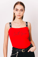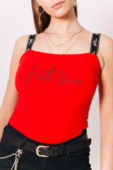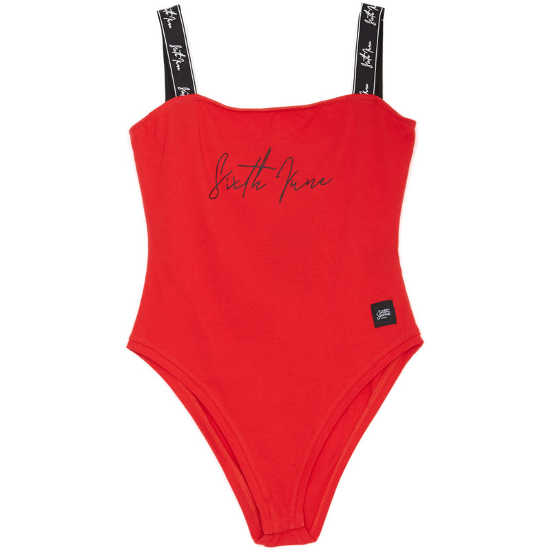 Body Sixth June pour femme avec logo "Sixth June" signature imprimé à l'avant. Coupe moulante, bretelles griffées et fond avec boutons à pression. Modèle rouge.