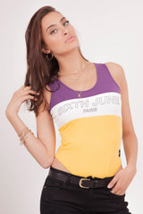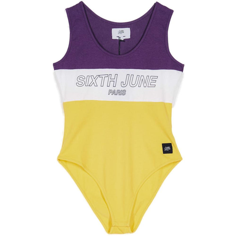Body tricolore femme Sixth June avec grand imprimé centrale Sixth June Paris. Coupe moulante, sans manches et fond avec boutons à pression. Modèle jaune, violet et blanc.