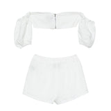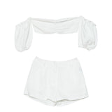 Top court bustier avec épaules dénudées, manches courtes bouffantes avec élastiques, short taille haute avec fermeture zippée et à cran. Motif à carreaux avec fil nacré, matière texturée.