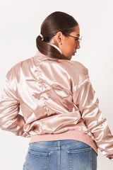 Bomber rose Sixth June Femme. Coupe oversize. Tissu brillant. Effet froncé sur les manches. Zip sur le bras gauche. Deux poches latérales.