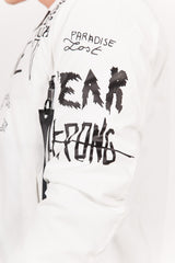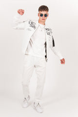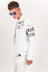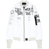 Veste bomber pour homme de marque Sixth June. Totalement réfléchissant, effet brillant et satiné à la lumière. Inscriptions et motifs à l'avant (crew, wild, Sixth June...), inscription "CREW" à l'arrière, bords-côtes à la base, au niveau du col et des poignets, fermeture zippée, poches latérales et une poche intérieure, zip sur le bras gauche. Coupe classique. Modèle blanc.