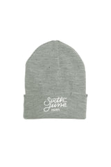 Bonnet gris Sixth June Homme. Effet destroy. Logo brodé Sixth June Paris. Etiquette de la marque au dos.