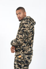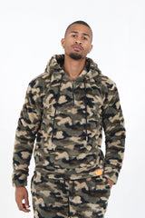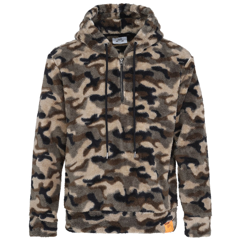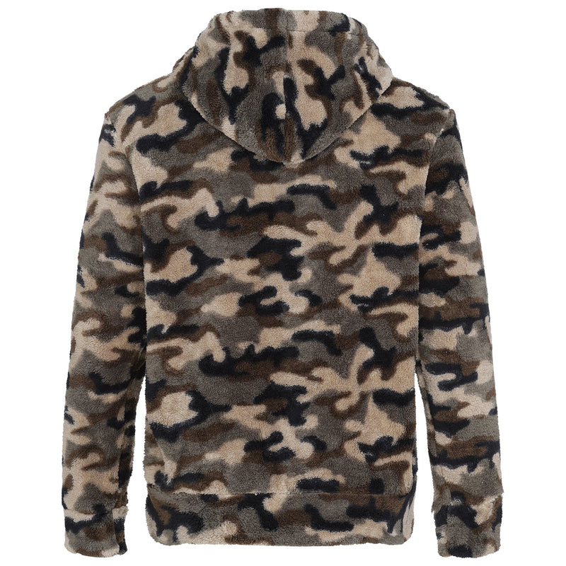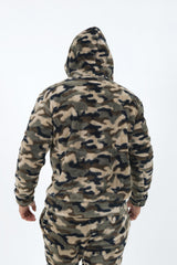 Imprimé camouflage avec une matière polaire, douce et chaude. Capuche avec cordon de serrage, zip au niveau du col.